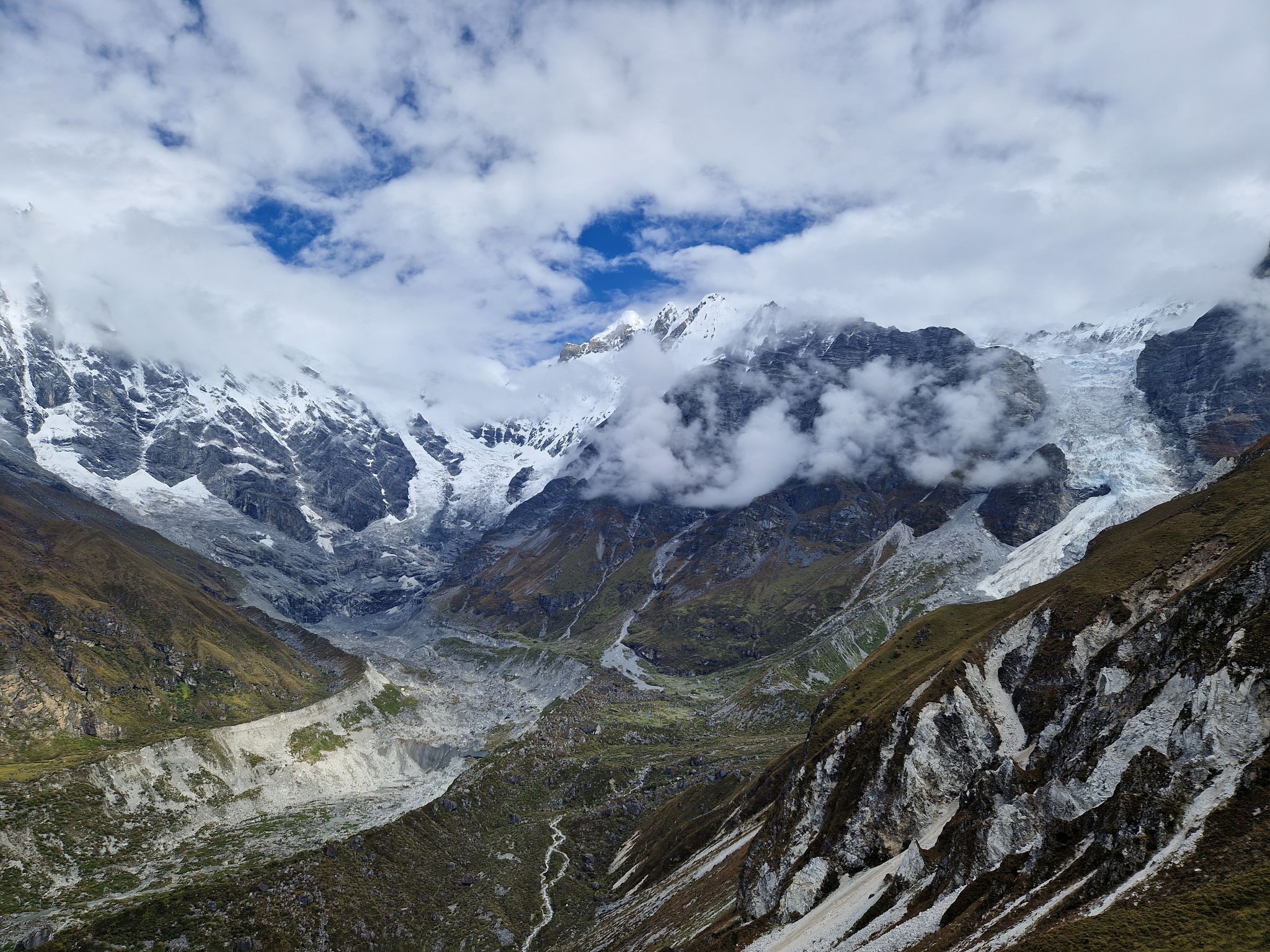 Today, we trek to Kyanjin Gompa, a picturesque village in the Langtang Valley known for its ancient Buddhist monastery and stunning views of the surrounding mountains. The journey takes us through yak pastures and rugged terrain, with the Langtang Lirung peak looming large in the background.
